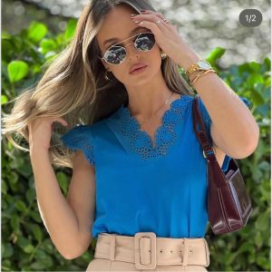 Blusa azul vibrante com detalhe em renda no decote e nas mangas, trazendo delicadeza e sofisticação. Perfeita para Jhoyers que amam um toque romântico no look. 💙✨