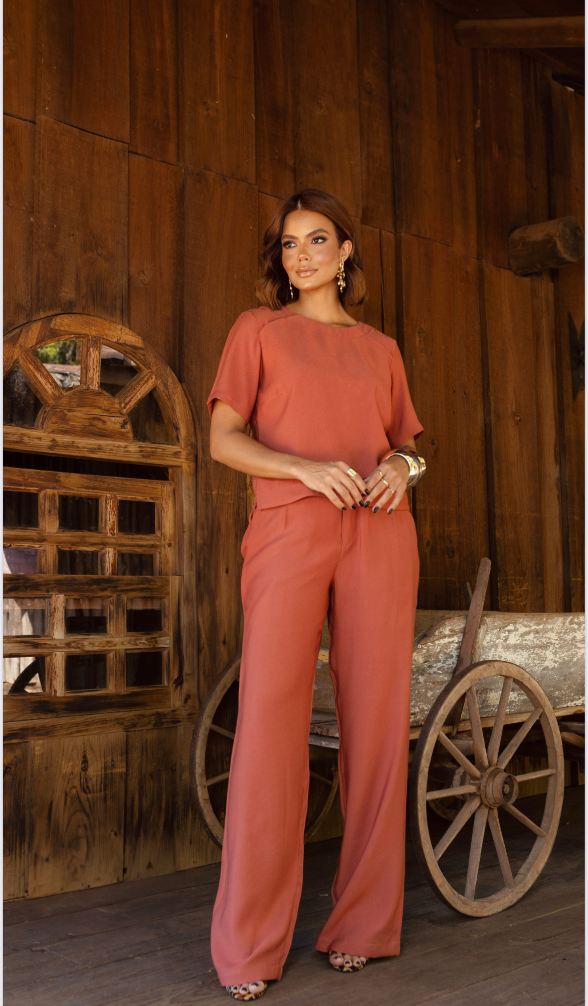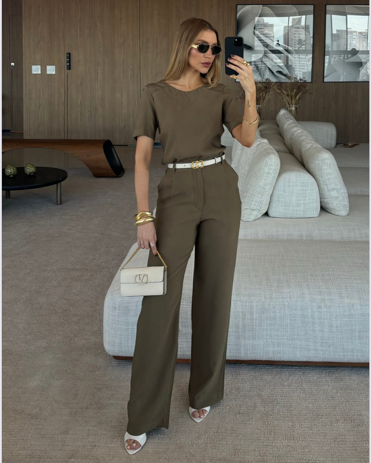 Conjunto com blusa de tecido leve e calça pantalona. Look monocromático elegante e confortável para todas as ocasiões.