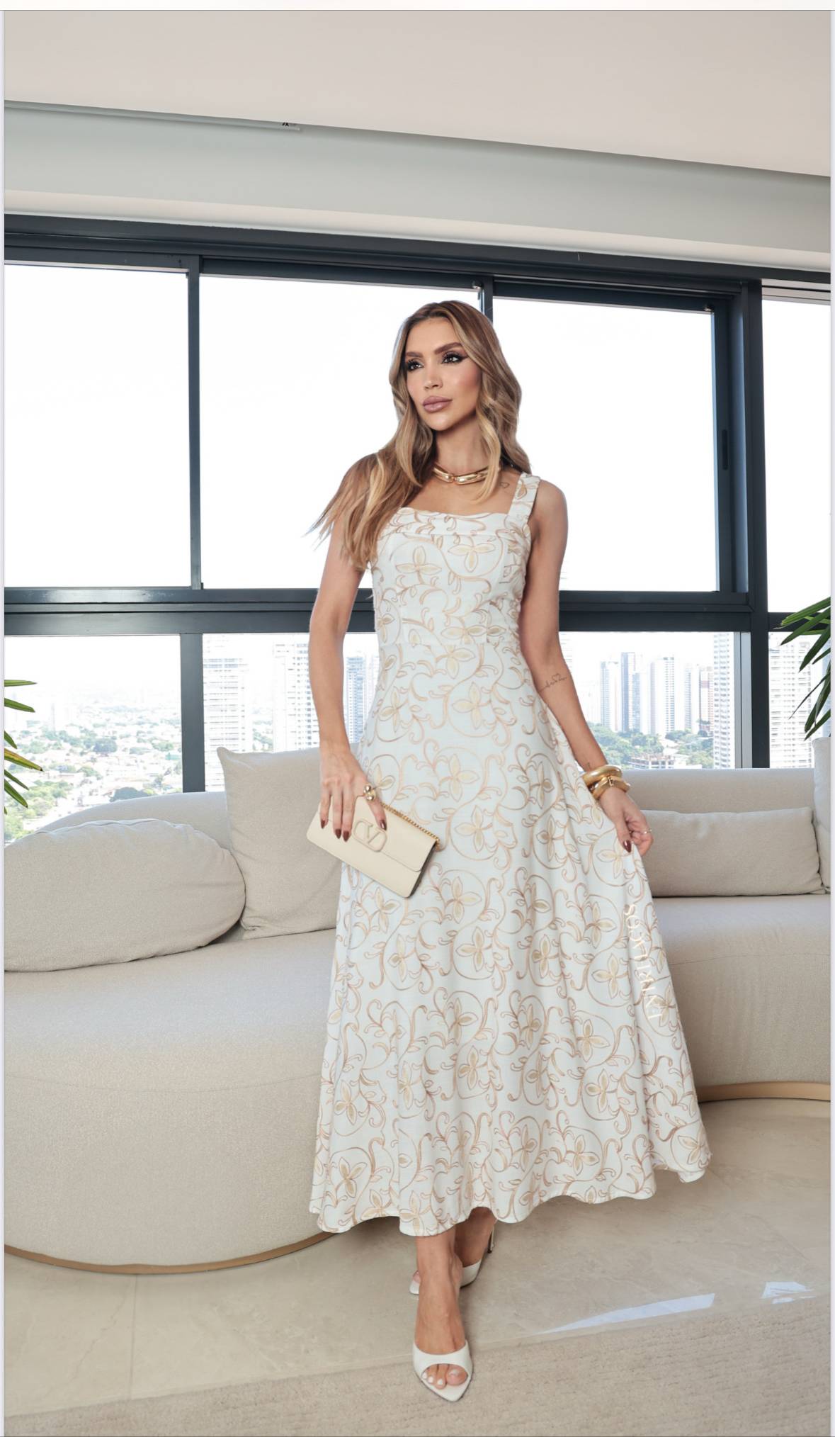 Vestido midi floral off white, com caimento impecável e detalhes elegantes. Perfeito para eventos sofisticados.